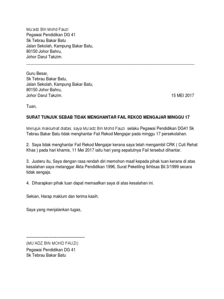 Surat rasmi tunjuk sebab lewat hantar surat ras. Surat tunjuk sebab merupakan salah satu urusan rasmi. Amat penting surat rasmi penjelasan tunjuk sebab dan alasan tidak hadir kerja ini bagi mengelakkan daripada dikenakan tindakan tata tertib . Oleh kerana surat tunjuk sebab merupakan urusan rasmi, maka surat ini pelrulah ditulis dalam format surat kiriman rasmi. Oleh itu, berikut dikongsikan contoh surat tunjuk sebab (tidak hadir kerja & lewat) sebagai rujukan untuk semua. Surat tunjuk sebab dalam konteks pekerjaan biasanya dikeluarkan oleh majikan. Panduan menulis surat rasmi tunjuk sebab kerana gagal hadir ke kuliah. Contoh surat tunjuk sebab kesalahan tata tertib have a graphic from the othercontoh surat . Surat tunjuk sebab merupakan salah satu urusan rasmi, jadi format surat rasmi perlu digunakan. Surat ini merupakan penjelasan atau maklum balas rasmi yang akan menjelaskan sebab ketidakakuran yang berlaku. By cika_1 in types > instruction manuals and formal letter. Untuk mendapatkan teknik format dan contoh surat tidak rasmi klik. Whatsapp atau sms tidak tergunapakai.